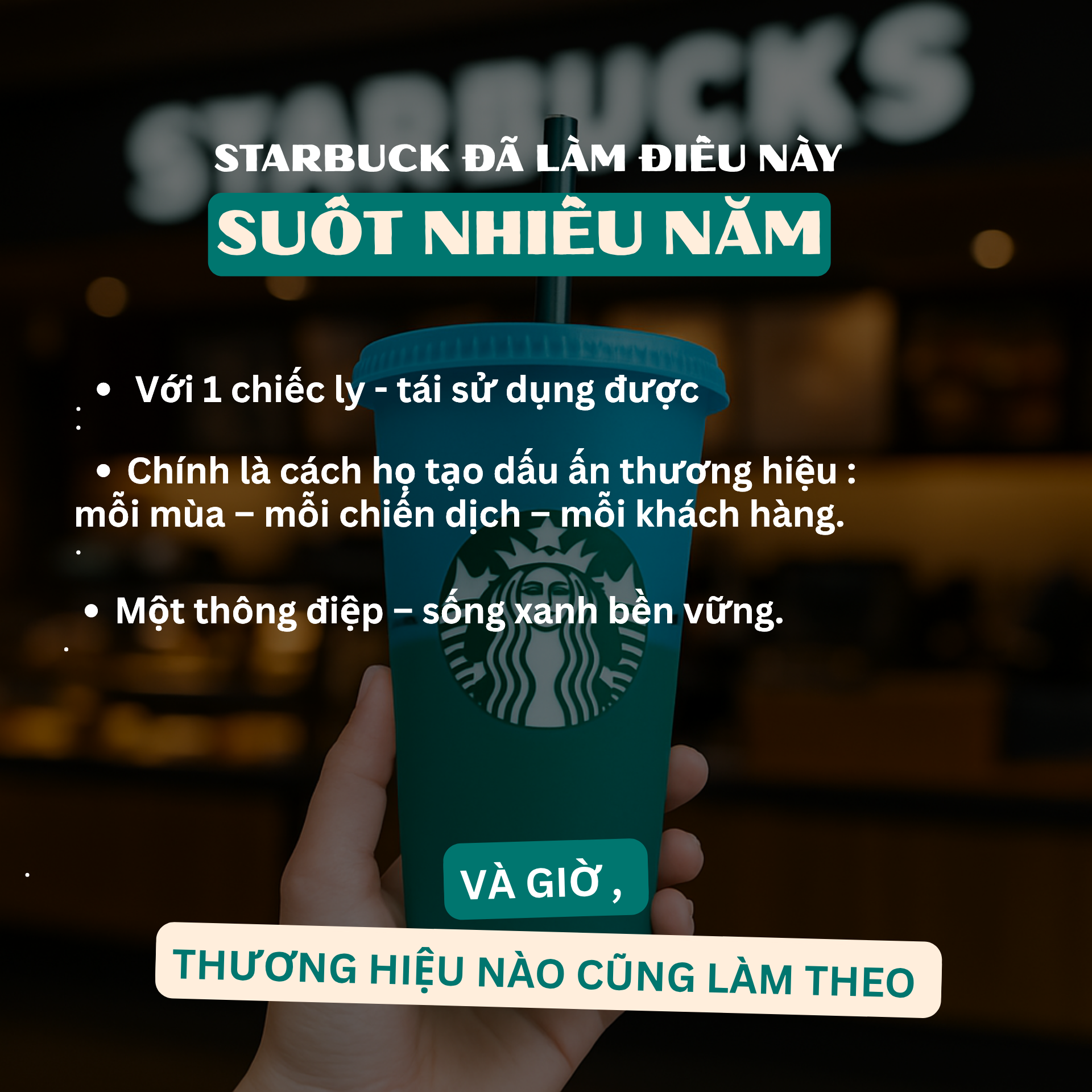 Starbucks khéo léo đưa từng chiếc ly vào chiến dịch quảng bá thương hiệu theo mùa, theo sự kiện hoặc thông điệp bền vững.
