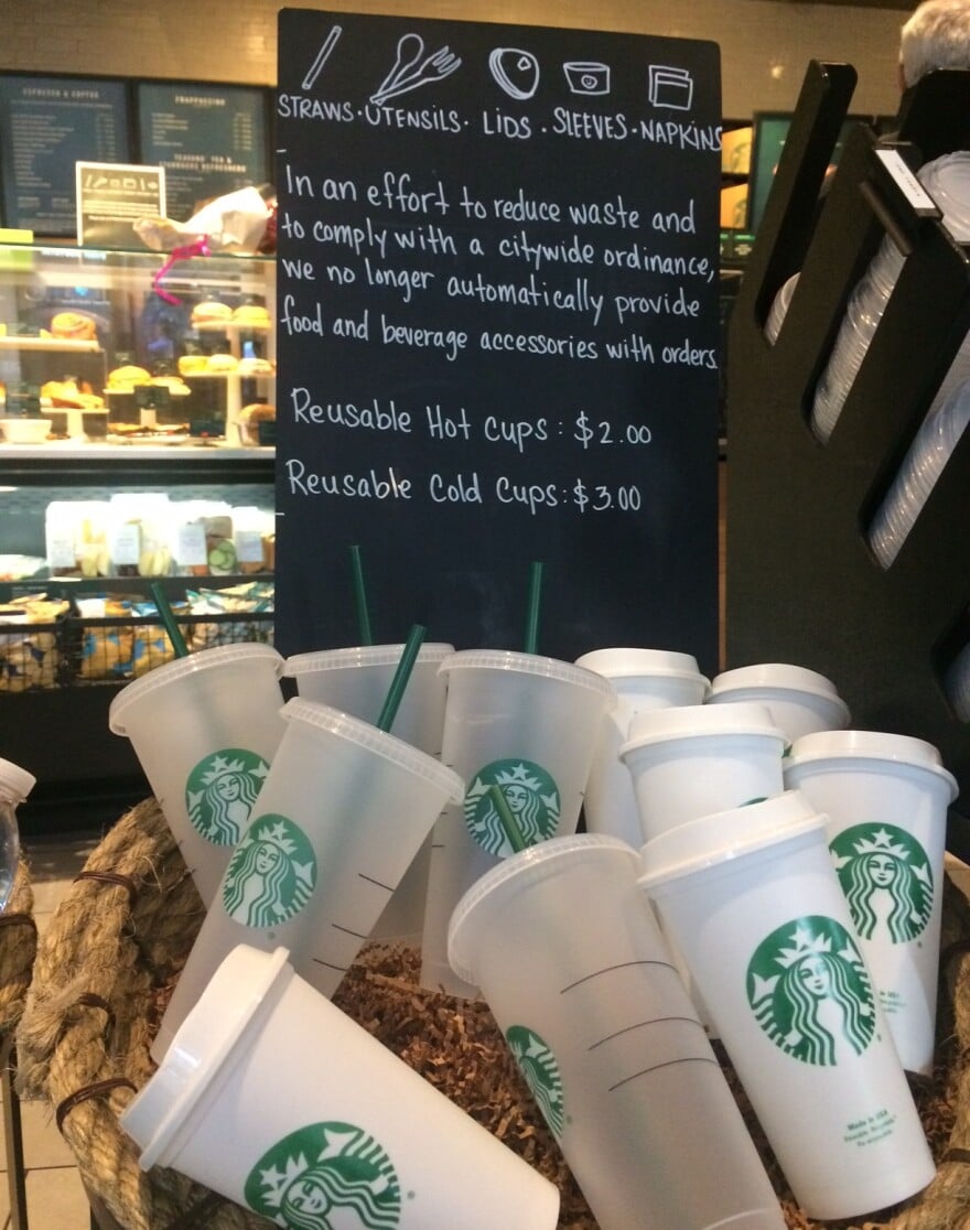 Tại Mỹ, văn hoá mang cà phê đi (take-away) rất phổ biến. Khách hàng chuộng ly tái sử dụng vì tính tiện lợi, bền vững và tiết kiệm. Starbucks còn khuyến khích thói quen này bằng cách giảm giá và tích điểm cho khách mang theo ly cá nhân.