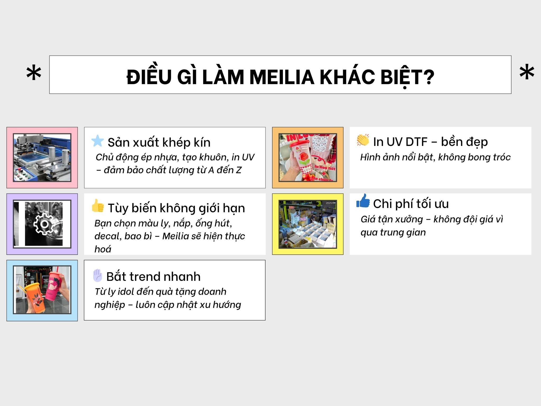 Với quy trình sản xuất hiện đại và đội ngũ giàu kinh nghiệm, Xưởng Meilia chuyên cung cấp các sản phẩm ly nhựa tái sử dụng chất lượng cao, in ấn và thiết kế theo yêu cầu. Chúng tôi giúp doanh nghiệp tạo nên quà tặng độc đáo, ấn tượng và tối ưu cho hoạt động marketing.